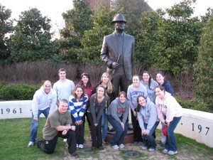 Despite the early morning departure from Logan, the students were almost chipper when they met me and the United Saints representatives at their lodgings. Soon after piling their sleeping bags into their new bunk beds, they were ready to go to the campus of my alma mater, where they could stretch their legs in the relative warmth of an afternoon in the high 40s. I walked them past Foster Auditorium – where Alabama Gov. George Wallace had made his symbolic “Stand in the Schoolhouse Door” against the integration plans advocated by President John F. Kennedy – and the President’s Mansion which had been saved from being burned to the ground by the pleas of the president’s wife, who softened the heart of the Union officer in charge. We compared our foot and hand prints to those left by the great Alabama football captains of the past, from Joe Willie Namath and Ken Stabler to Cornelius Bennett and Javier Arenas – the last of whom barely survived the storm, and then drove supplies back from Kansas City, where he now plays for the Chiefs. To my surprise, they had already decided as a group to throw themselves into the sports culture – it was clear that we had to buy their Crimson Tide t-shirts as soon as possible. They also made it clear that the cultural immersion aspect of the SEND philosophy mandated we see Monday’s national championship game with LSU at a public locale that captured the region. (We’ll see on that one.)