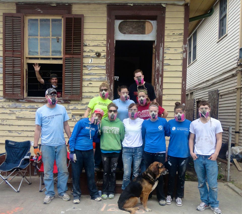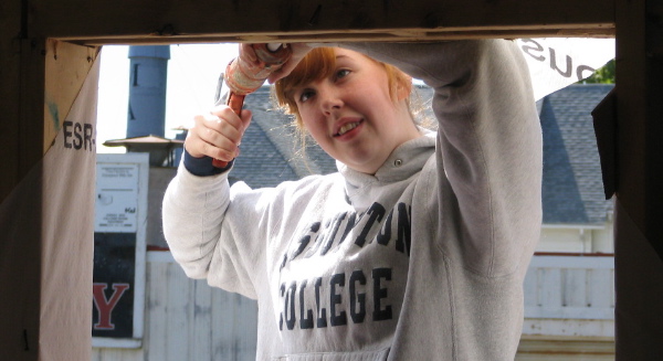 Today’s lesson: Window installation. He walked them through one, asking for one student to serve as volunteer. Maggie Hanley, then a first-year Assumption student, gamely raised her hand. Soon she was peering in at us from a ladder, caulking around the edges of the window frame. I noticed that some students homed in, while others seemed restless. Glancing at my watch, I wondered how we were going to reach our goal: Install all of the windows on the two-story duplex.