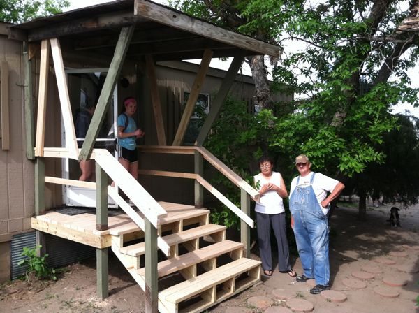 We came there to rip out the front and back steps, replacing them with new ones that were much safer. While the Disney version of this story would culminate in a sprawling quaint porch painted in bright colors, our mission was to make do with what we had – mixing mostly new lumber with old pieces that still seemed sound; the roof mounted over the front steps would have to remain for another visit by another crew. While some pieces of lumber were treated to protect from water damage, other pieces were not. Would our new work be stained with some kind of protective water seal? Perhaps. But money was tight for both the home-owner and for Re-Member, hustling all over to help folks with the most basic needs. As we worked, one staffer shrugged at the limitations with a resigned look. “Today the priority is just giving her and her family a safe way to get in and out of her house,” he said. “Hopefully we can come back and do more later.”