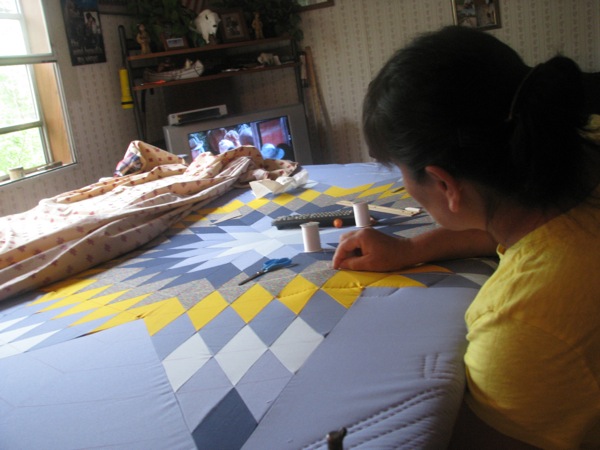 But our host had one thing about half the people on the rez lack – and that thing was indoor plumbing. Since the old steps disappeared after I entered, I had to wait patiently in the living room for the carpenters to create my exit. Which was fine. It gave me time to watch the construction of something as artistically dazzling as our porch was not – a Lakota star quilt, one of cheerful sky blue and rich yellow.