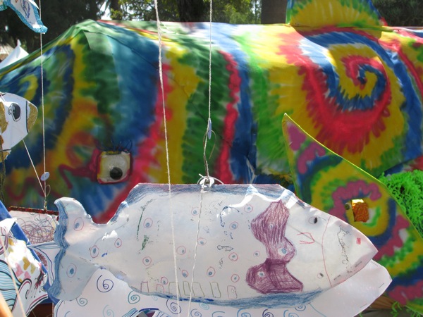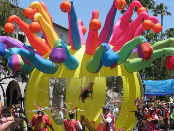 Of course, Santa Barbara, like New Orleans, is more than one thing – so much is in the eye of the beholder. My particular lens found no topless women – and no signs of angry defiance. But the Summer Solstice parade made the colors of Bourbon Street seem pale in comparison. From the sidewalk chalk wishing the sun “happy birthday” and the scores of observers wearing fairy wings to the imagination and hilarity of the costumes and floats, my surroundings kept me in alternate states of wonder and amusement for two solid hours. The parade’s theme was “Creatures,” and there certainly were some, from Mrs. Creature from the Black Lagoon (cradling her Baby Creature from the Black Lagoon) and a rooster fish to a colorful lost whale shark and the Wizard of Odd. True, there was also joy in the recognizably human forms, particularly the pulsating bodies of dancers, moving mostly to festive Latin beats, while working in some gymnastics along the way. But the happiest moments came when the parade transcended the realm of the identifiable – floats and costumes that were such flights of fancy, I couldn’t easily name them, or guess the rationale behind what I was seeing.