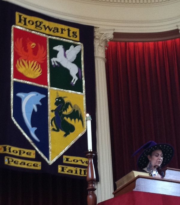 I settled in my usual pew for the Sunday service at First Unitarian – and that was the only usual thing about it. From the pulpit hung four colorful banners, each featuring a creature – dolphin, dragon, phoenix and “wind horse.” Many children and adults were in costumes that connoted magic; they waved their glowing wands in unison at key moments in the service. The offering was collected by people with elf ears – after it was explained that ELFS in this context stood for “Enriching Life through Fun and Service.” A few rows ahead of me, the back of a youth’s t-shirt stated the theme on the order of worship: “It’s better to light a wand than curse the darkness.”