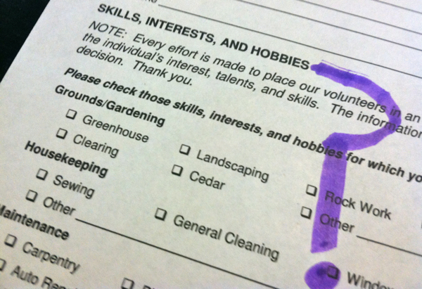 Specifically, volunteer forms. Not surprisingly, non-profits that offer lodging in exchange for volunteer hours (and usually a modest rent) want to know if I can actually do anything.