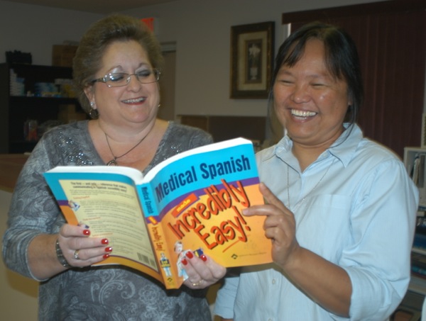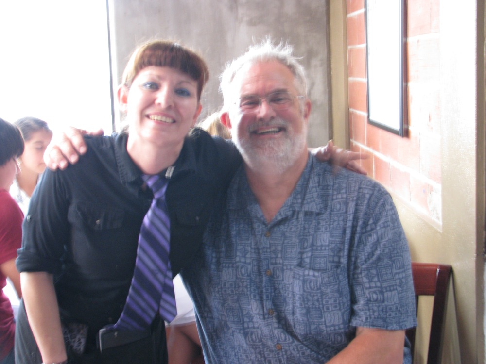 “Pastor Alison” and parishioner have laugh between Monday homeless breakfast and beginning of Immigrant Trail walk.